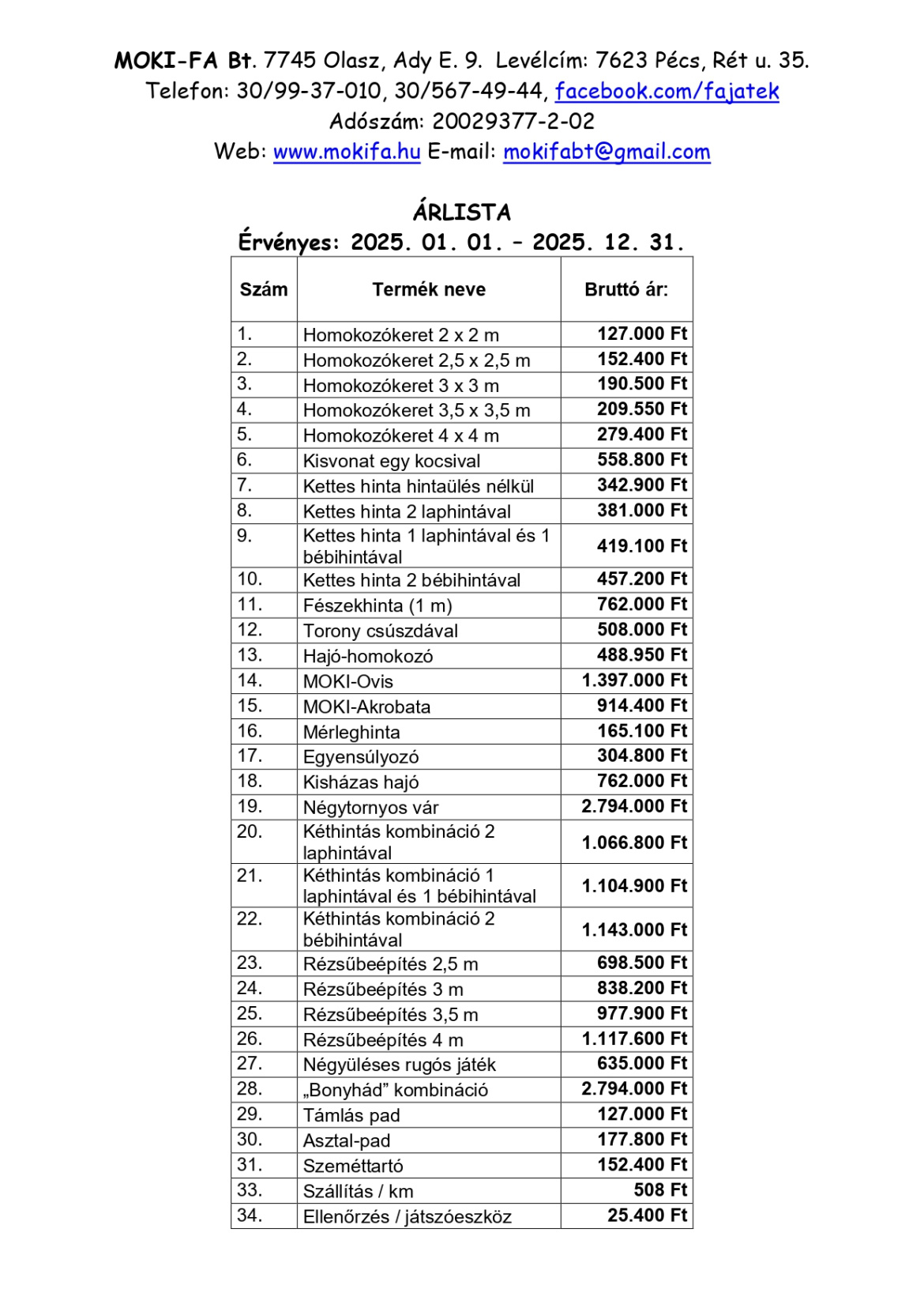 Az árak nem tartalmazzák a szállítás, az ütéscsillapító talaj és az első kötelező ellenőrzés költségét.